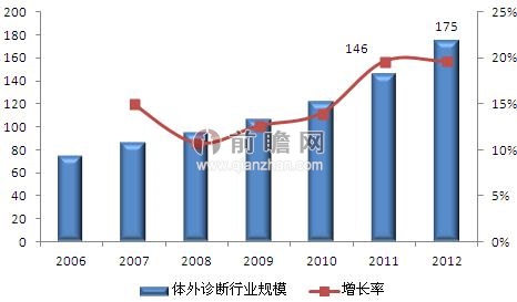 前瞻產(chǎn)業(yè)院《2013-2017年中國體外診斷行業(yè)市場需求預(yù)測與投資戰(zhàn)略規(guī)劃分析報告》數(shù)據(jù)顯示,2006年以來,國內(nèi)體外診斷產(chǎn)業(yè)以15%左右的年增長率呈現(xiàn)高速增長態(tài)勢。據(jù)統(tǒng)計,2008年我國體外診斷市場規(guī)模已達(dá)95億元,2010年增長至122億元,2011年突破140億元,到2012年,我國體外診斷市場規(guī)模約為175億元。
